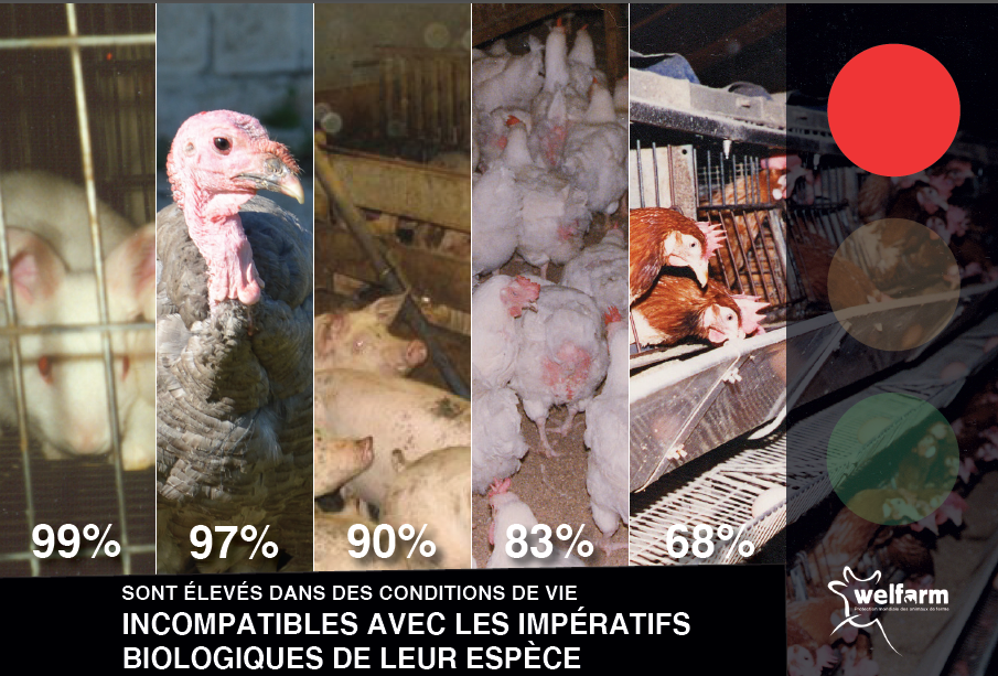 Aujourd‘hui, plus de 99% des lapins, 97% des dindes, 90% des porcs, 83% des poulets de chair, 68% des poules pondeuses et 50% des chèvres sont enfermés dans des bâtiments sans accès à l‘extérieur. Pour la très grande majorité des espèces élevées à des fins alimentaires, l‘élevage hors-sol est la norme : confinement, inconfort physique, lumière artificielle, densité d‘animaux élevée, impossibilité d‘exprimer les comportements naturels de leur espèce… Ces animaux souffrent en conséquence de nombreux maux, blessures, pathologies diverses, frustrations récurrentes et de stress chronique.