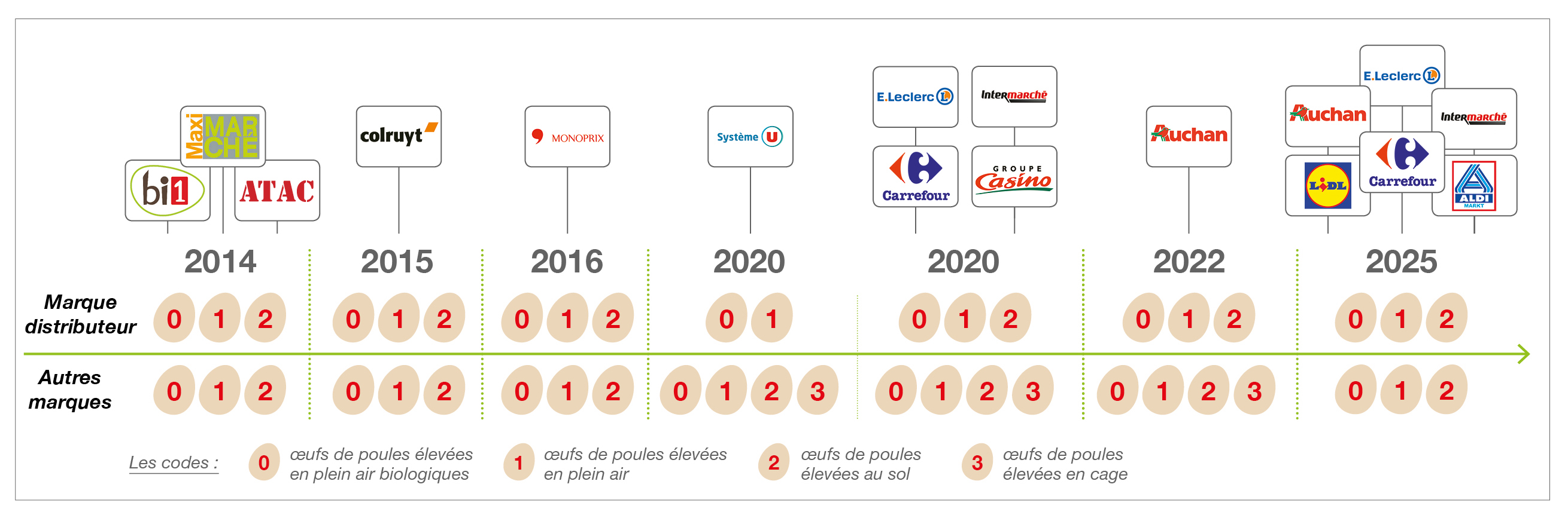 Les engagements successifs des distributeurs et des principaux acteurs de la restauration collective pour la suppression des œufs issus de poules élevées en cage ont conduit la filière à engager une réflexion sur l‘avenir de la production d‘œufs en France. Ainsi, le CNPO (Comité National pour la Promotion de l’œuf) présentait en fin d‘année 2016 son Contrat Sociétal d‘Avenir qui fixe notamment l‘objectif d‘atteindre 50 % de poules pondeuses en élevages alternatifs d‘ici 2022 (contre 32 % en 2016).