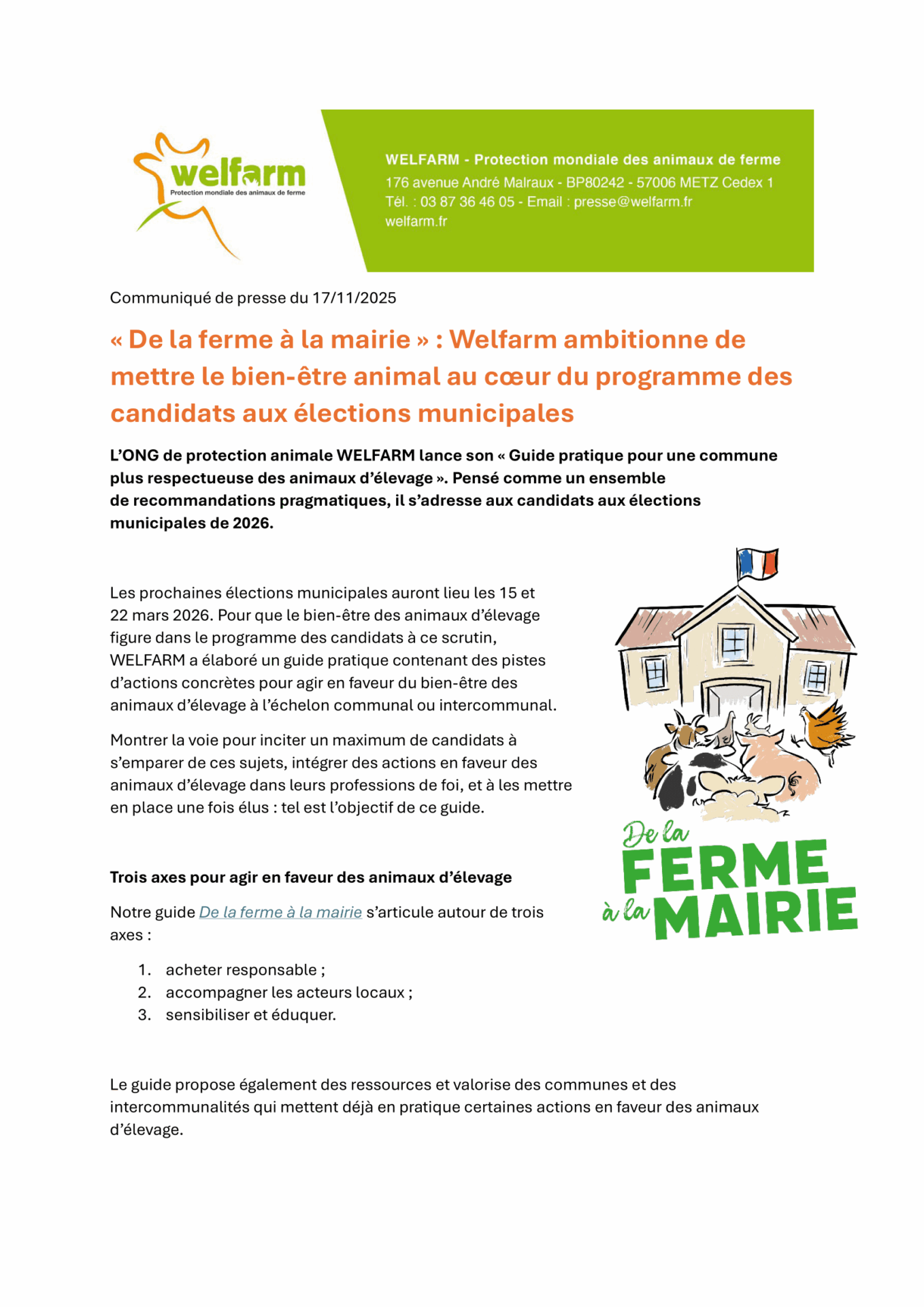 Communiqué de presse du 17 novembre 2025 – « De la ferme à la mairie » : Welfarm ambitionne de mettre le bien-être animal au cœur du programme des candidats aux élections municipales